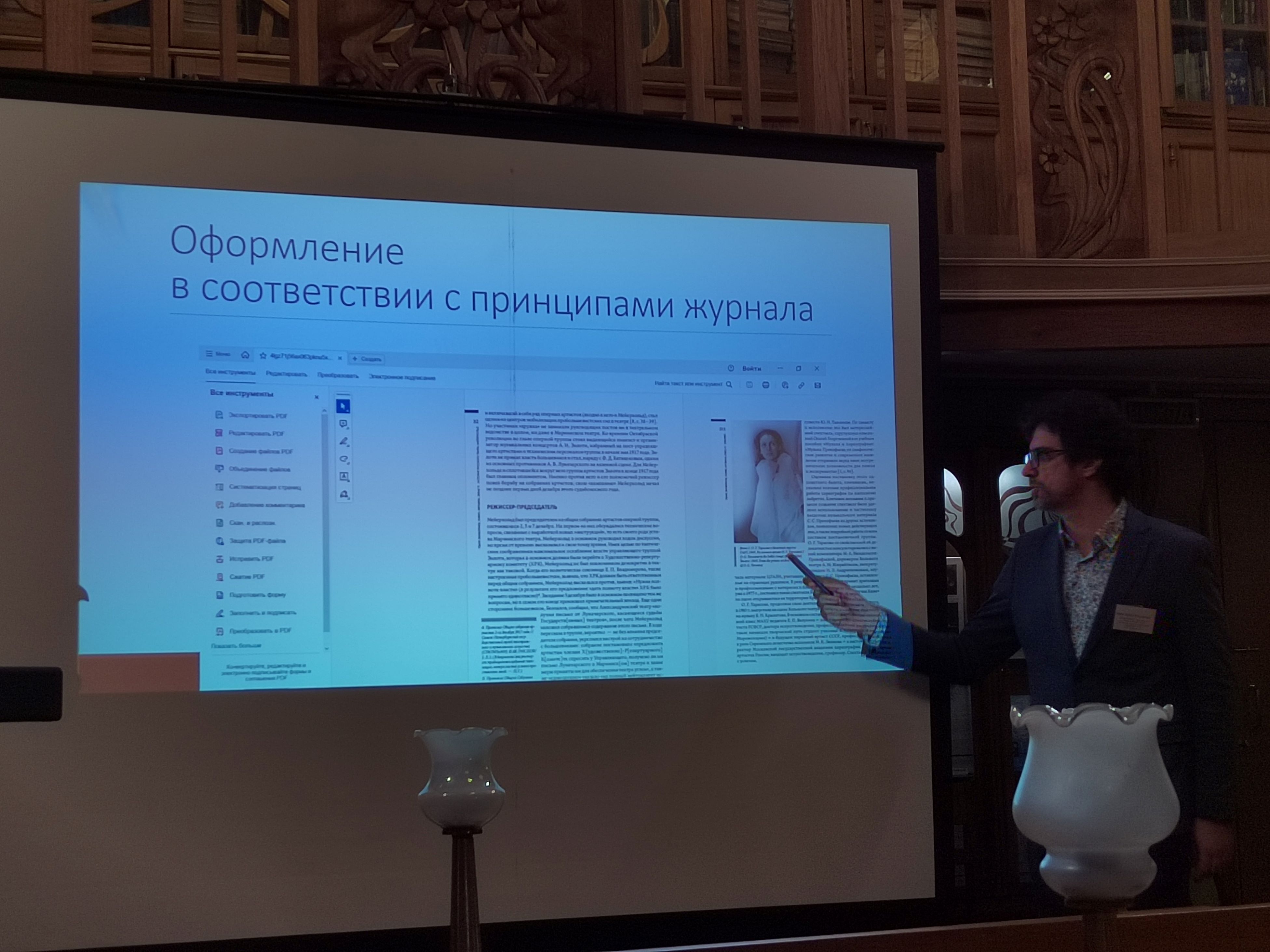 После короткого перерыва с пленарными докладами выступали Щербаков Вадим Анатольевич, главный редактор журнала «Вопросы театра. Proscaenium», кандидат искусствоведения и Зорин Артем Николаевич, главный редактор журнала «Театр. Живопись. Кино. Музыка», доктор филологических наук, которые рассказали аспирантам и молодым ученым об этапах работы над научной статьёй для рецензируемого журнала, редакционных требованиях, критериях рецензирования и общей оценке потенциала исследовательских публикаций.