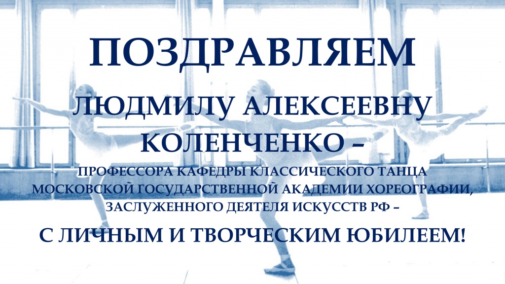 ПОЗДРАВЛЯЕМ ЛЮДМИЛУ АЛЕКСЕЕВНУ КОЛЕНЧЕНКО – профессора кафедры классического танца Московской государственной академии хореографии, заслуженного деятеля искусств РФ – С ЛИЧНЫМ И ТВОРЧЕСКИМ ЮБИЛЕЕМ!