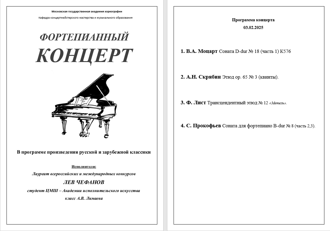 На кафедре концертмейстерского мастерства и музыкального образования 3 февраля 2025 года состоялся Концерт фортепианной музыки студента ЦМШ – Академии исполнительского искусства Льва Чефанова (класс А.В. Лимаева)
