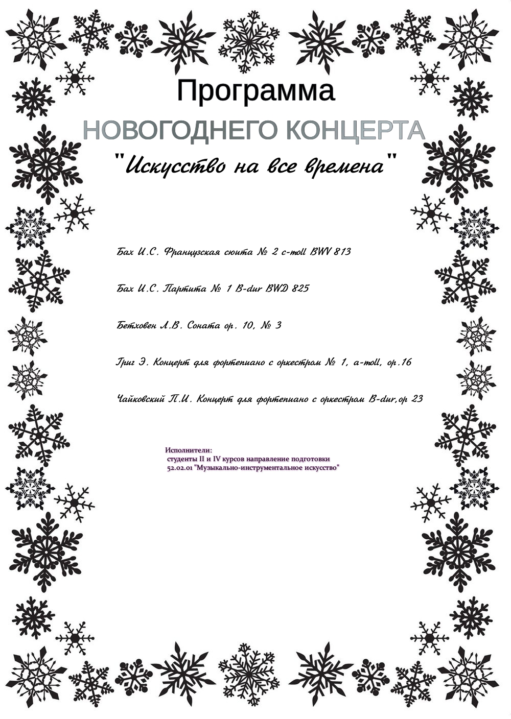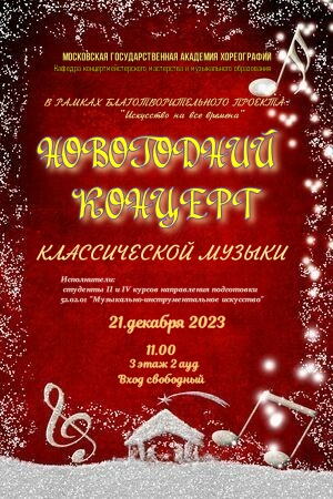 21 декабря 2023 года состоялся концерт в рамках благотворительного проекта "Искусство на все времена". В концерте принимали участие студенты II и IV курсов направления подготовки 53.03.02 "Музыкально-инструментальное искусство" (бакалавриат).