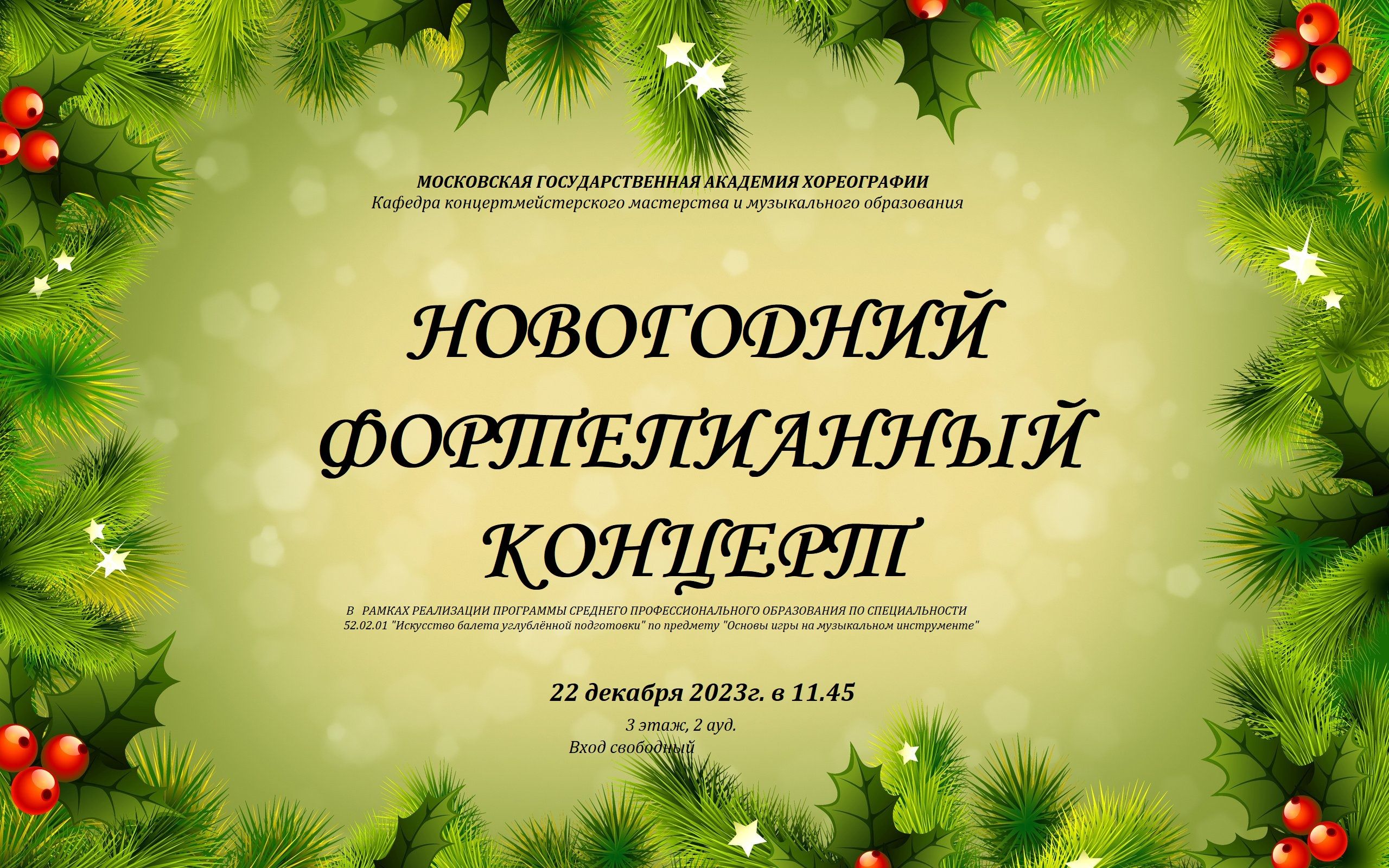22 декабря 2023 года прошел Новогодний концерт. В концерте принимали участие ученики 1-4 классов (направление 52.02.01 " искусство балета углублённой подготовки").