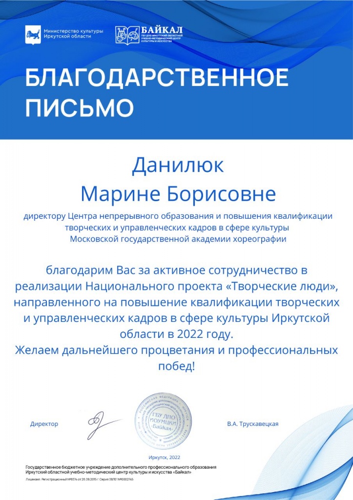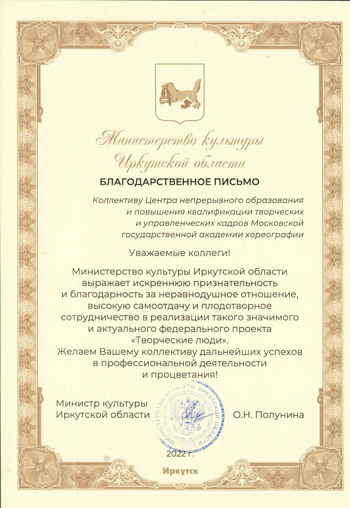 Благодарственные письма от министерства культуры Иркутской области