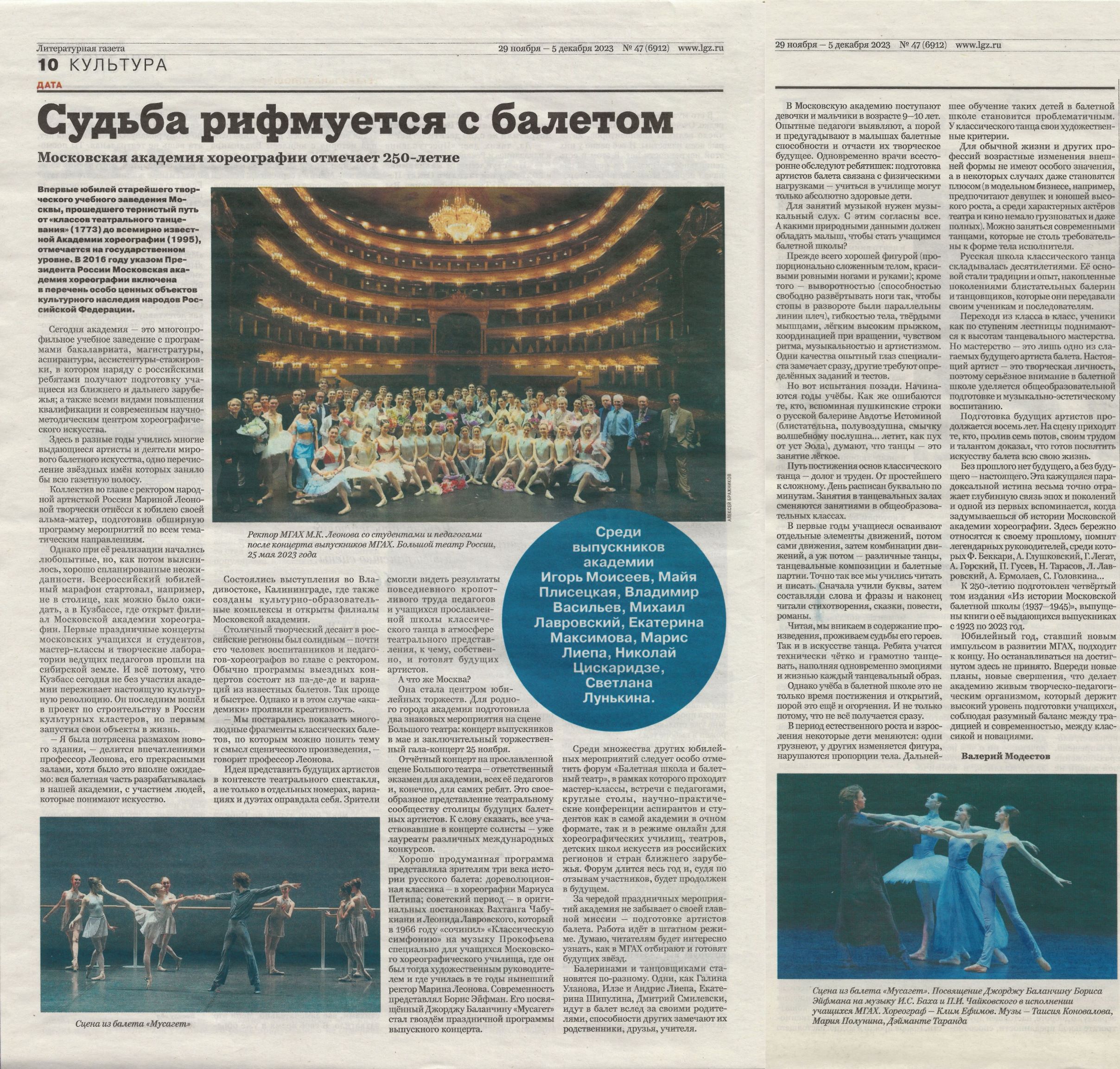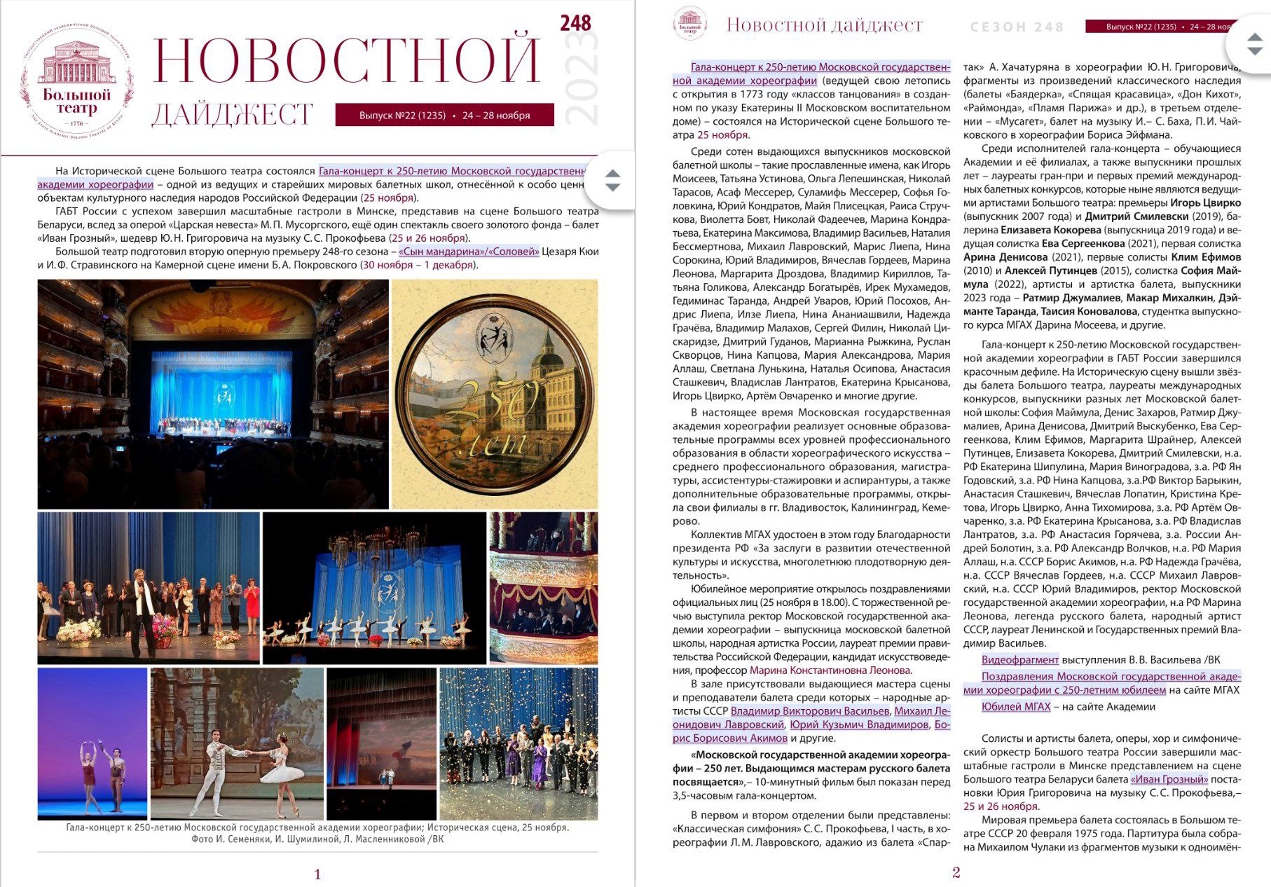25 ноября 2023 года на Исторической сцене Большого театра состоялся Гала-концерт к 250-летию Московской государственной академии хореографии.
