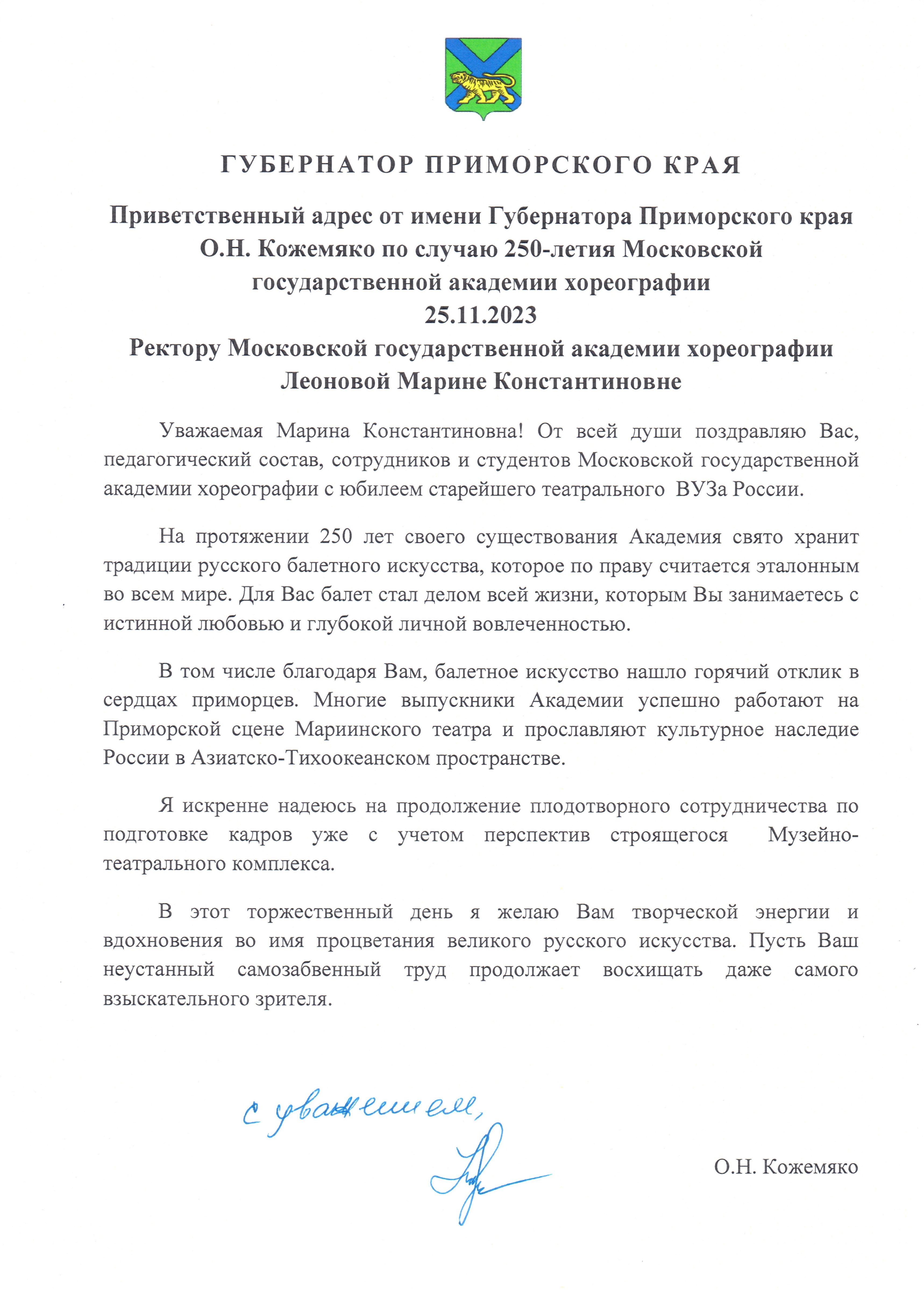 Приветствие в адрес Московской государственной академии хореографии от Губернатора Приморского края Олега Николаевича Кожемяко зачитал Заместитель Председателя Правительства региона Алексей Евгеньевич Наздратенко.