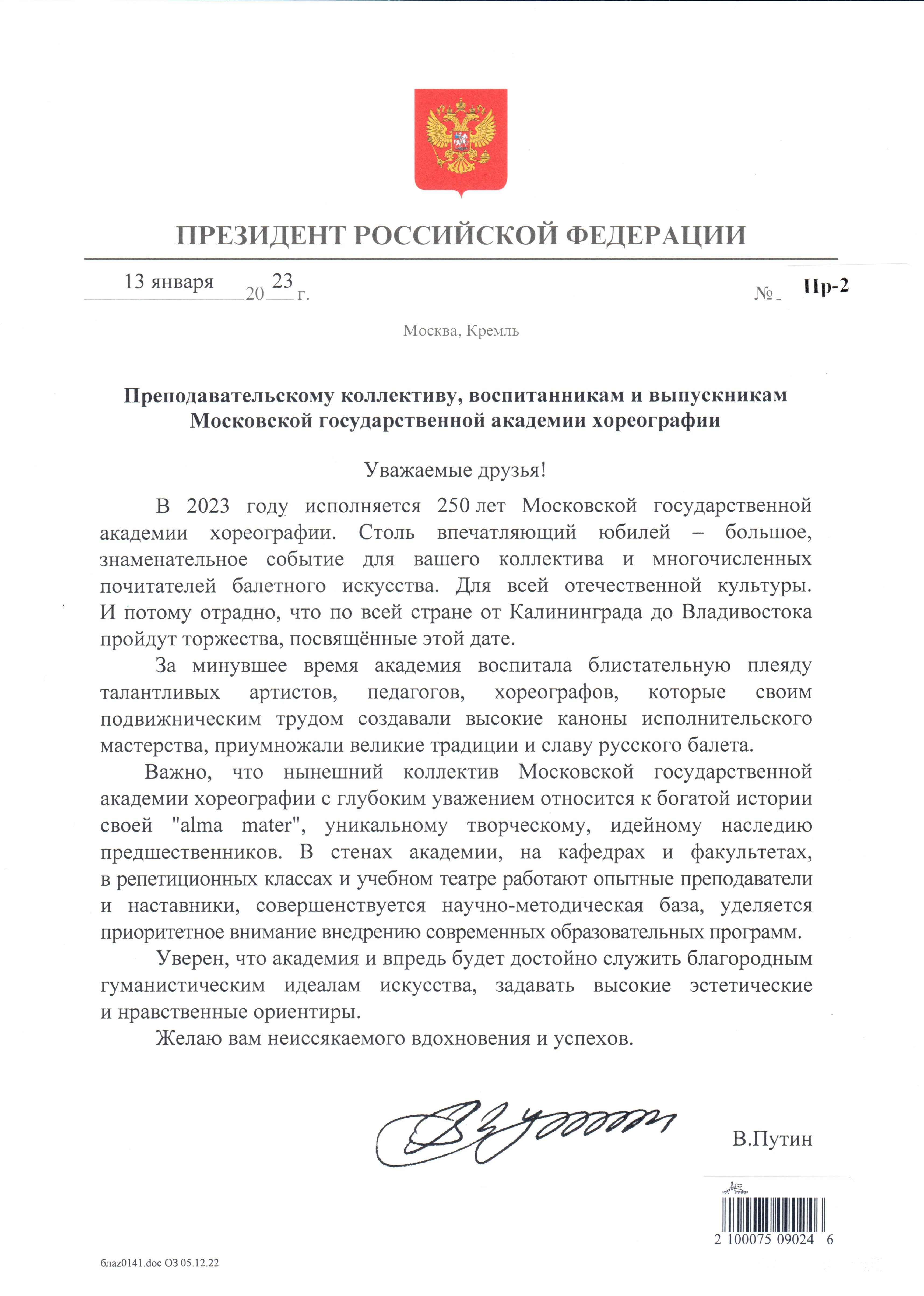 В этом году коллектив Московской государственной академии хореографии удостоен Благодарности Президента Российской Федерации «За заслуги в развитии отечественной культуры и искусства, многолетнюю плодотворную деятельность».