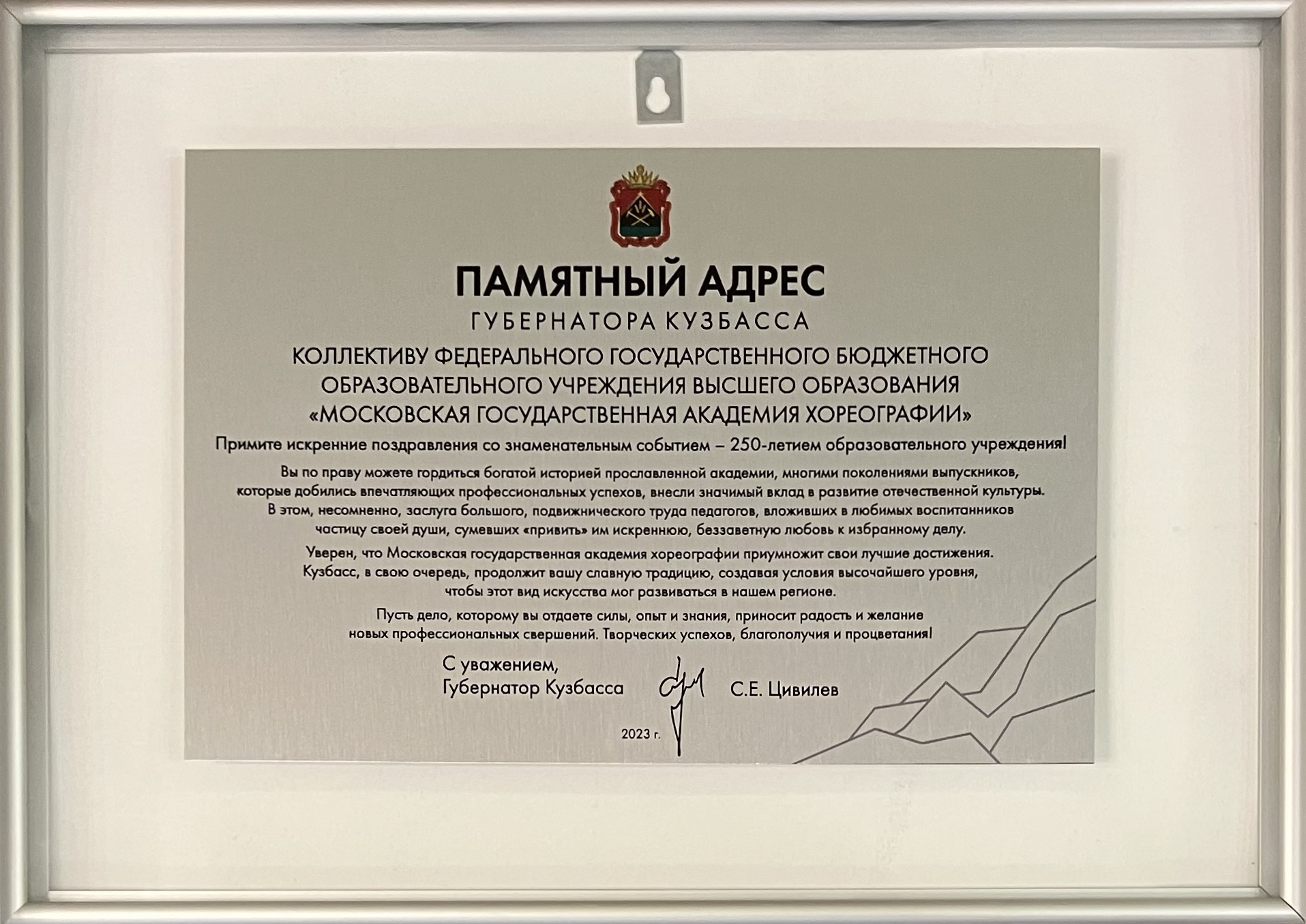 Губернатор Кемеровской области – Кузбасса Сергей Евгеньевич Цивилёв в торжественной обстановке вручил ректору Московской государственной академии хореографии Марине Константиновне Леоновой Памятный адрес коллективу Академии.