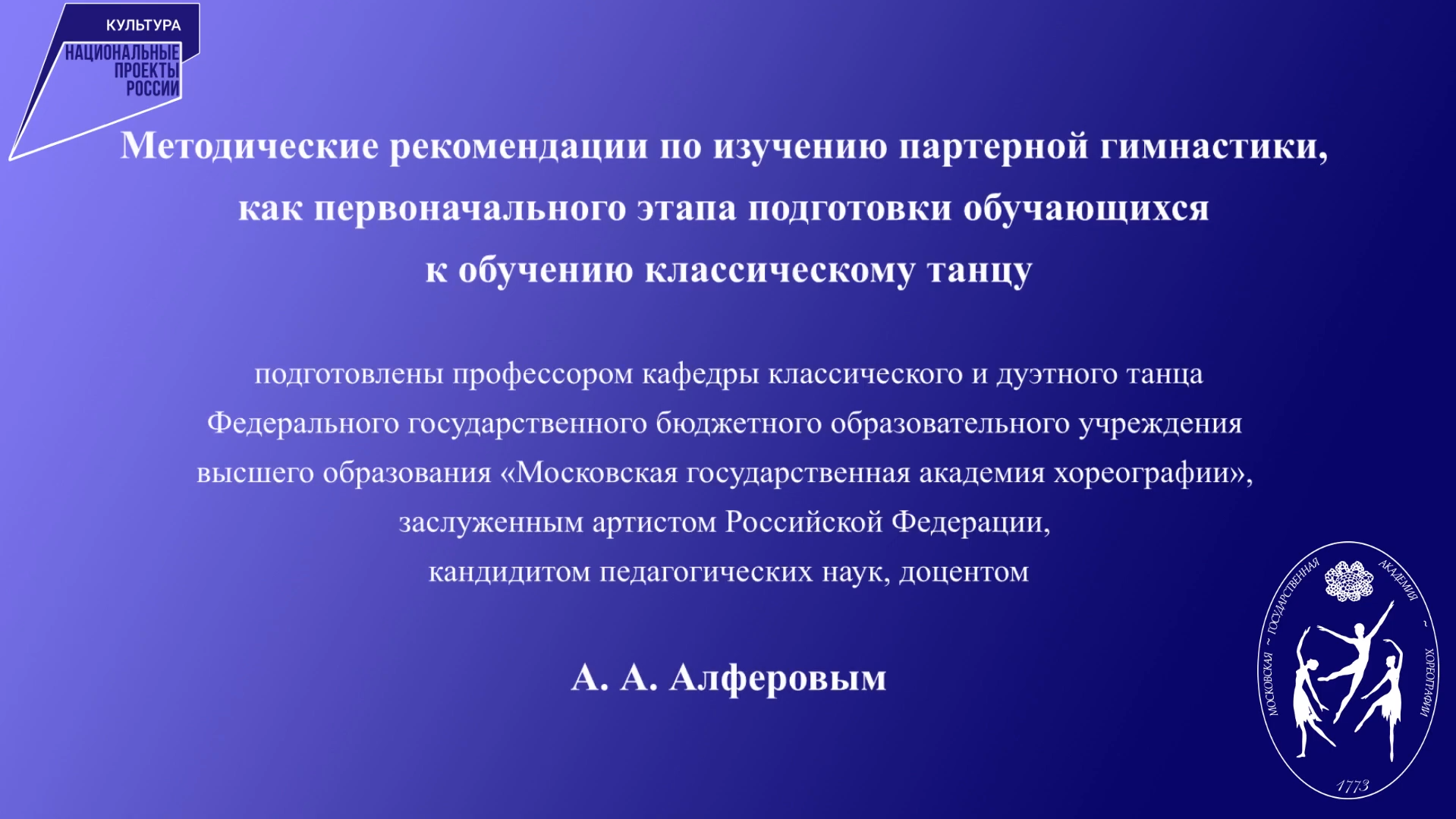 Методические рекомендации «Изучение партерной гимнастики, как первоначального этапа подготовки обучающихся к обучению классическому танцу» - Алферов А.А., декан исполнительского факультета, профессор кафедры классического и дуэтного танца, заслуженный артист РФ, к.п.н.